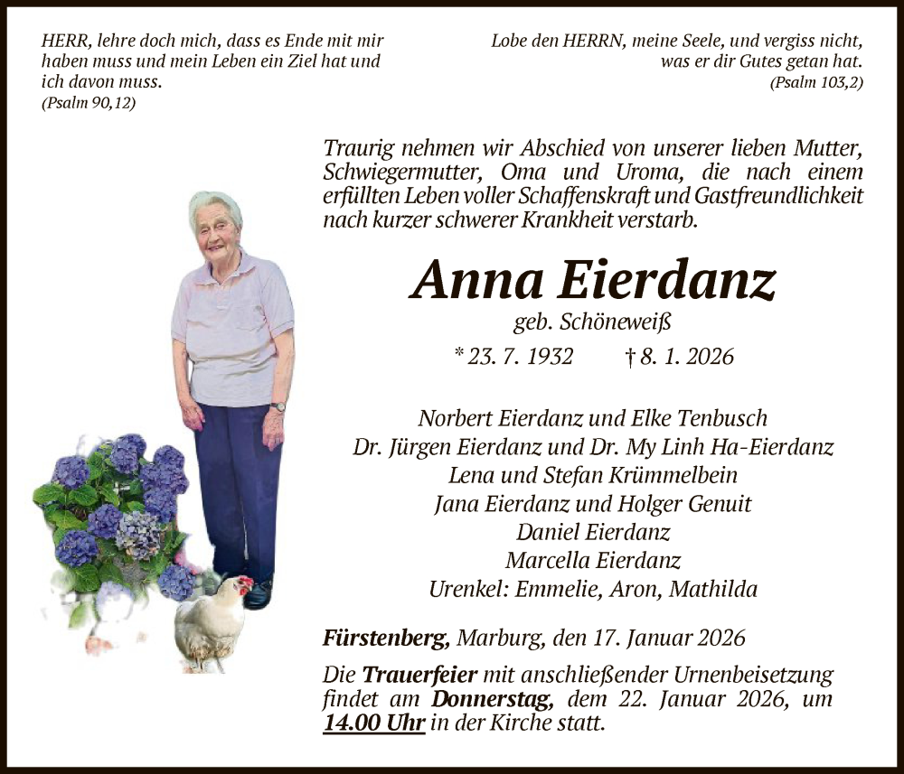 Hier finden Sie alle Traueranzeigen aus der Zeitung, die bisher für Anna Eierdanz erschienen sind. Weitere Traueranzeigen, die in der Zeitung erscheinen, werden hier ebenfalls aufgelistet
