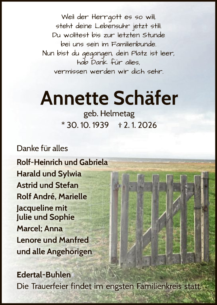Hier finden Sie alle Traueranzeigen aus der Zeitung, die bisher für Annette Schäfer erschienen sind. Weitere Traueranzeigen, die in der Zeitung erscheinen, werden hier ebenfalls aufgelistet