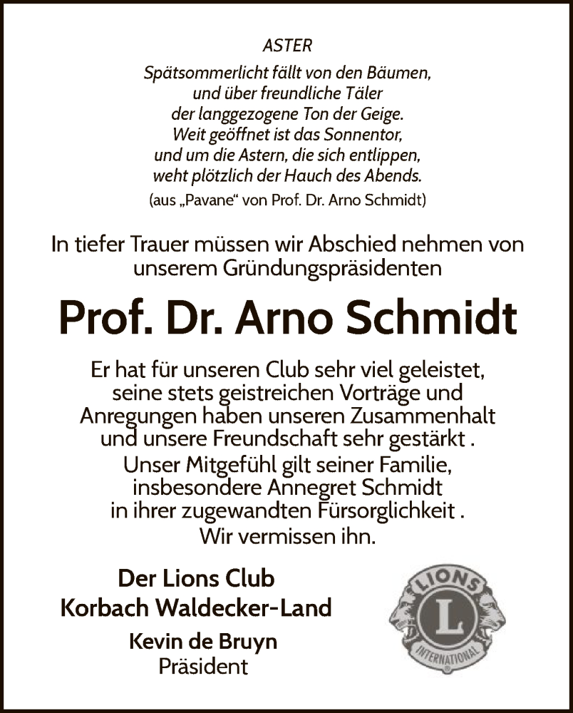 Hier finden Sie alle Traueranzeigen aus der Zeitung, die bisher für Arno Schmidt erschienen sind. Weitere Traueranzeigen, die in der Zeitung erscheinen, werden hier ebenfalls aufgelistet