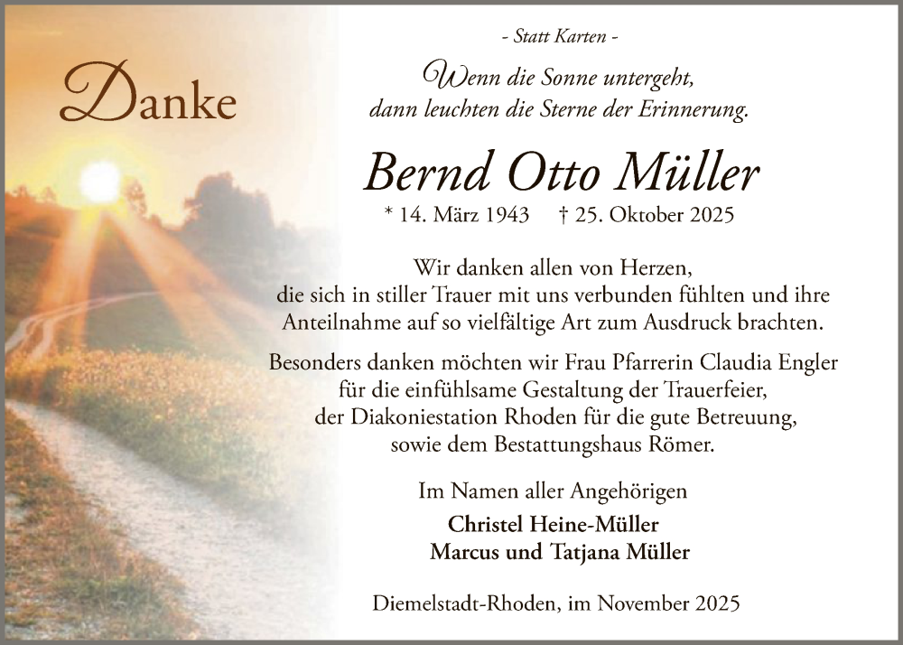 Hier finden Sie alle Traueranzeigen aus der Zeitung, die bisher für Bernd Otto Müller erschienen sind. Weitere Traueranzeigen, die in der Zeitung erscheinen, werden hier ebenfalls aufgelistet