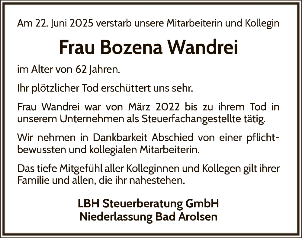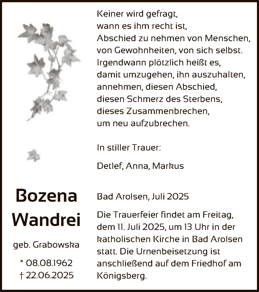 Hier finden Sie alle Traueranzeigen aus der Zeitung, die bisher für Bozena Wandrei erschienen sind. Weitere Traueranzeigen, die in der Zeitung erscheinen, werden hier ebenfalls aufgelistet