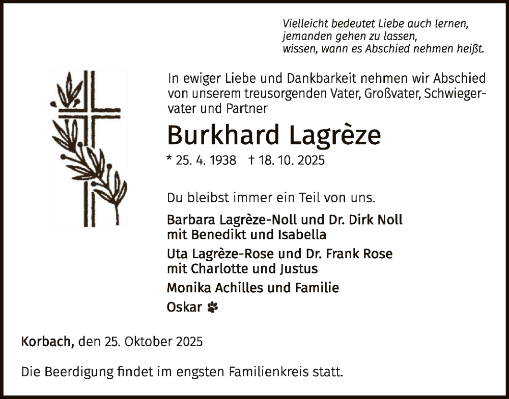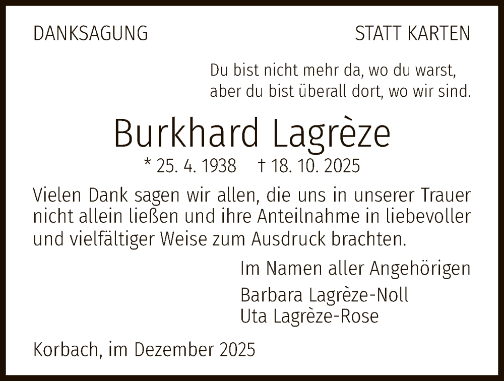 Hier finden Sie alle Traueranzeigen aus der Zeitung, die bisher für Burkhard Lagreze erschienen sind. Weitere Traueranzeigen, die in der Zeitung erscheinen, werden hier ebenfalls aufgelistet