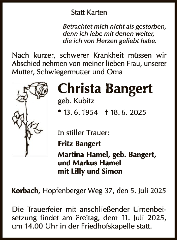 Hier finden Sie alle Traueranzeigen aus der Zeitung, die bisher für Christa Bangert erschienen sind. Weitere Traueranzeigen, die in der Zeitung erscheinen, werden hier ebenfalls aufgelistet