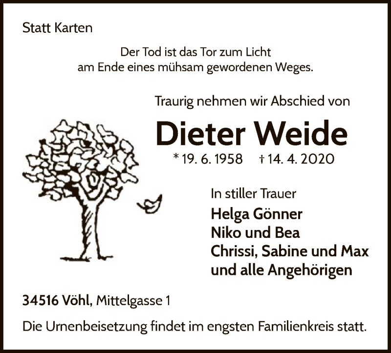 Hier finden Sie alle Traueranzeigen aus der Zeitung, die bisher für Dieter Weide erschienen sind. Weitere Traueranzeigen, die in der Zeitung erscheinen, werden hier ebenfalls aufgelistet