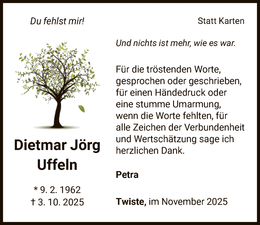 Hier finden Sie alle Traueranzeigen aus der Zeitung, die bisher für Dietmar Jörg Uffeln erschienen sind. Weitere Traueranzeigen, die in der Zeitung erscheinen, werden hier ebenfalls aufgelistet