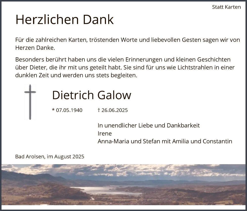 Hier finden Sie alle Traueranzeigen aus der Zeitung, die bisher für Dietrich Galow erschienen sind. Weitere Traueranzeigen, die in der Zeitung erscheinen, werden hier ebenfalls aufgelistet