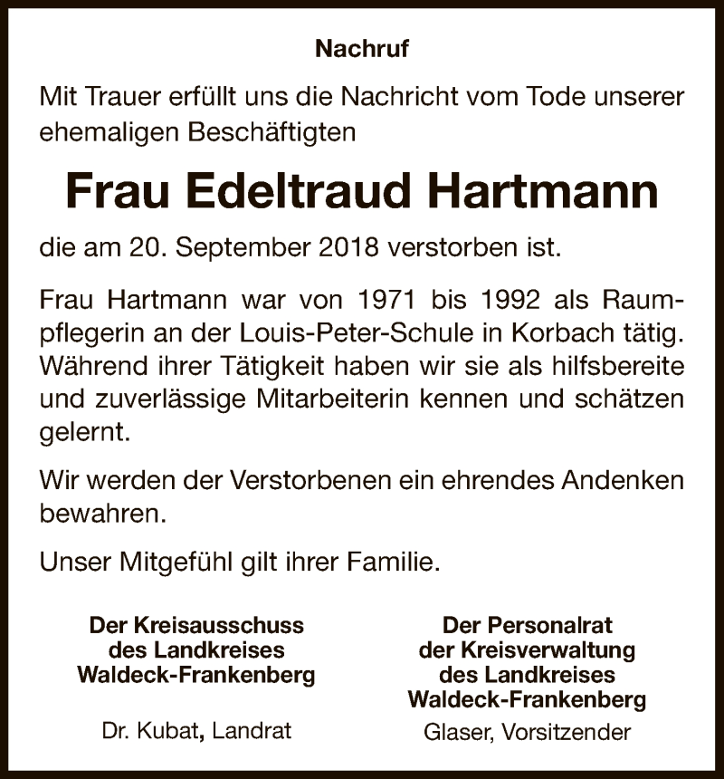 Hier finden Sie alle Traueranzeigen aus der Zeitung, die bisher für Edeltraud Hartmann erschienen sind. Weitere Traueranzeigen, die in der Zeitung erscheinen, werden hier ebenfalls aufgelistet