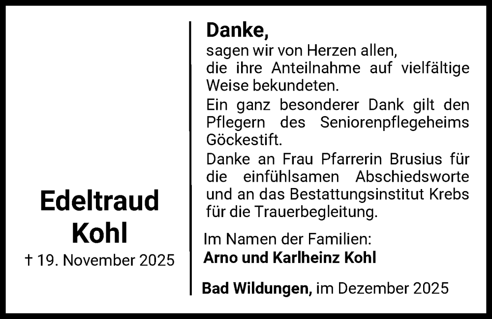 Hier finden Sie alle Traueranzeigen aus der Zeitung, die bisher für Edeltraud Kohl erschienen sind. Weitere Traueranzeigen, die in der Zeitung erscheinen, werden hier ebenfalls aufgelistet