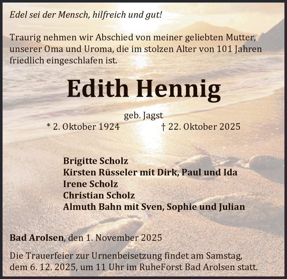 Hier finden Sie alle Traueranzeigen aus der Zeitung, die bisher für Edith Hennig erschienen sind. Weitere Traueranzeigen, die in der Zeitung erscheinen, werden hier ebenfalls aufgelistet