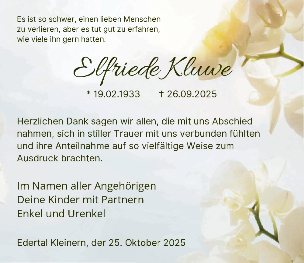 Hier finden Sie alle Traueranzeigen aus der Zeitung, die bisher für Elfriede Kluwe erschienen sind. Weitere Traueranzeigen, die in der Zeitung erscheinen, werden hier ebenfalls aufgelistet