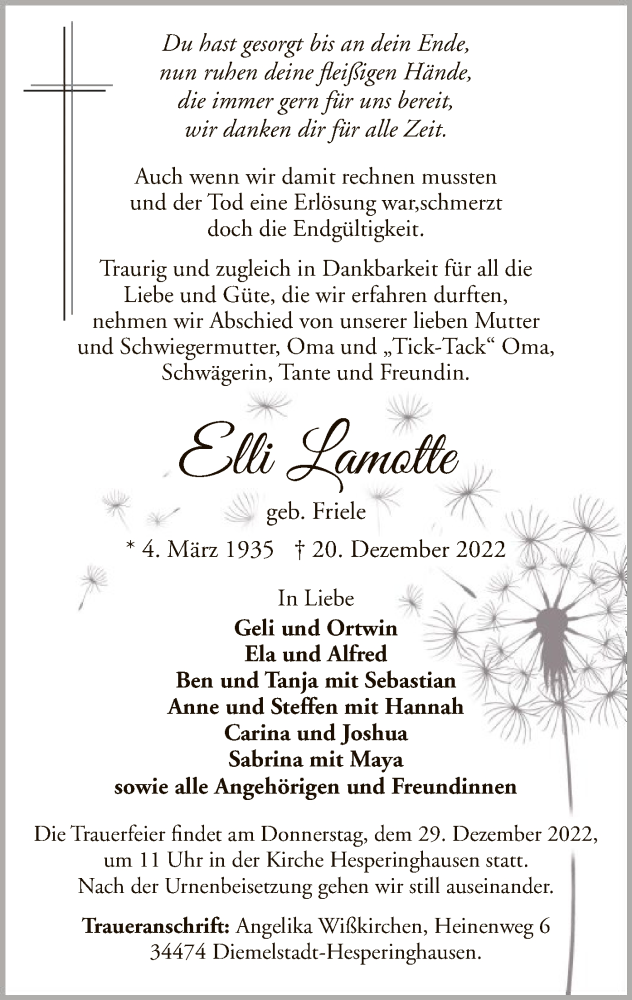Hier finden Sie alle Traueranzeigen aus der Zeitung, die bisher für Elli Lamotte erschienen sind. Weitere Traueranzeigen, die in der Zeitung erscheinen, werden hier ebenfalls aufgelistet