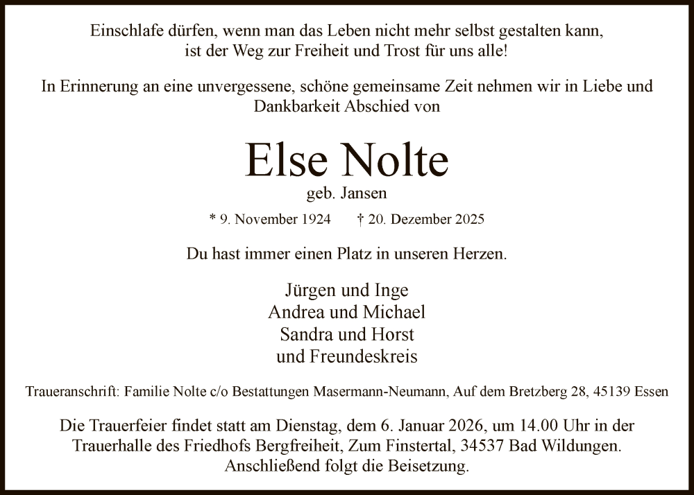 Hier finden Sie alle Traueranzeigen aus der Zeitung, die bisher für Else Nolte erschienen sind. Weitere Traueranzeigen, die in der Zeitung erscheinen, werden hier ebenfalls aufgelistet