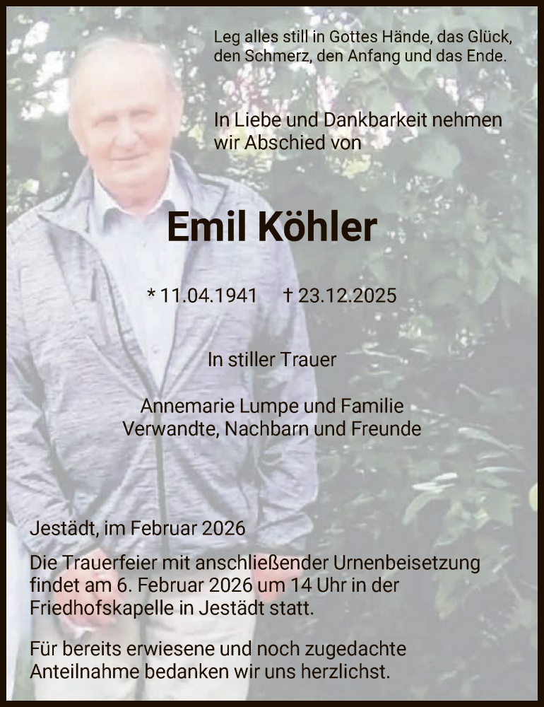 Hier finden Sie alle Traueranzeigen aus der Zeitung, die bisher für Emil Köhler erschienen sind. Weitere Traueranzeigen, die in der Zeitung erscheinen, werden hier ebenfalls aufgelistet