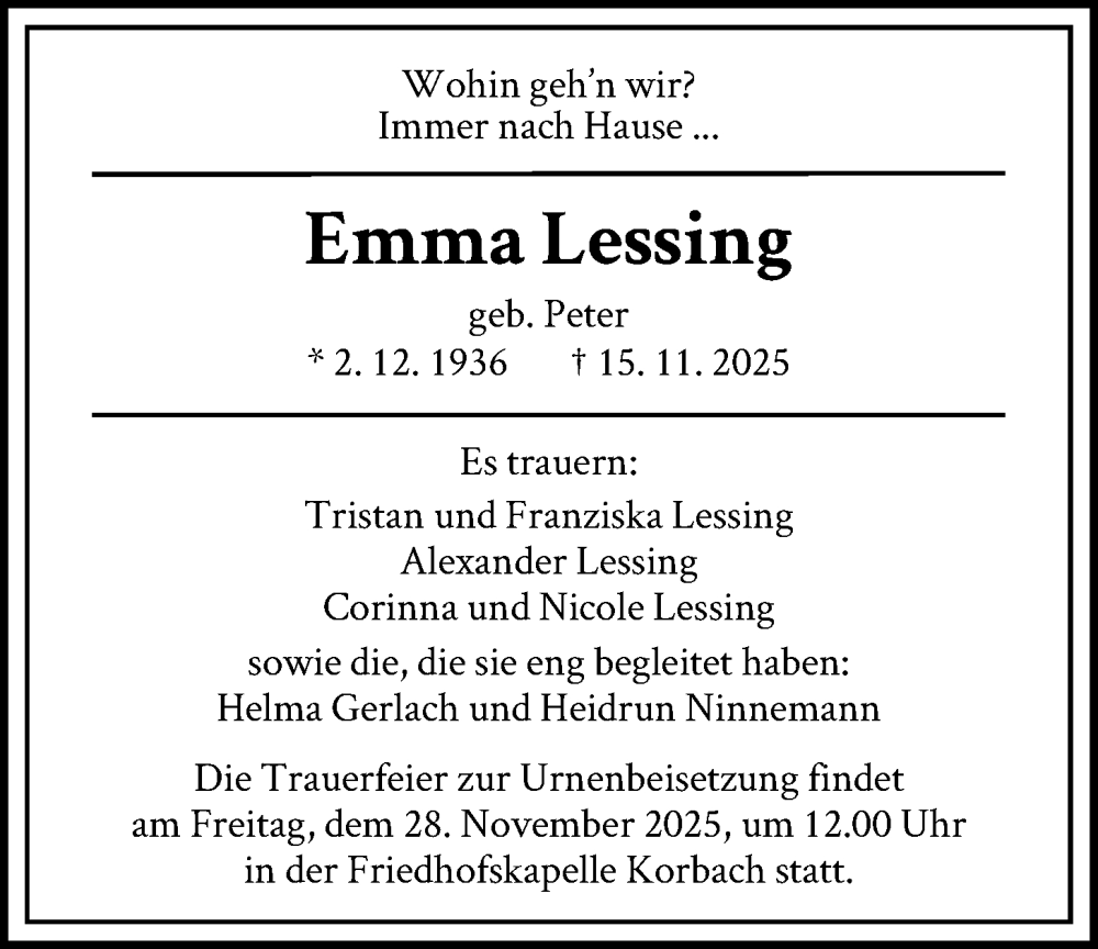 Hier finden Sie alle Traueranzeigen aus der Zeitung, die bisher für Emma Lessing erschienen sind. Weitere Traueranzeigen, die in der Zeitung erscheinen, werden hier ebenfalls aufgelistet