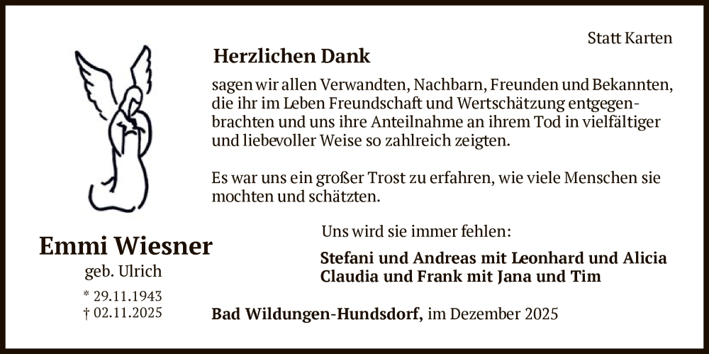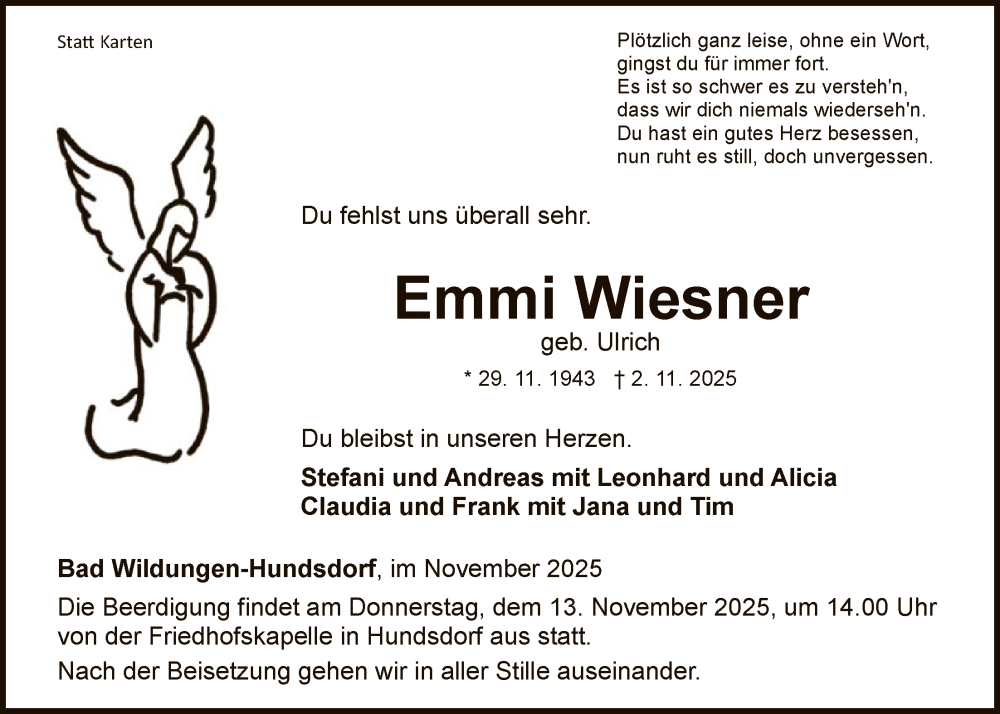 Hier finden Sie alle Traueranzeigen aus der Zeitung, die bisher für Emmi Wiesner erschienen sind. Weitere Traueranzeigen, die in der Zeitung erscheinen, werden hier ebenfalls aufgelistet