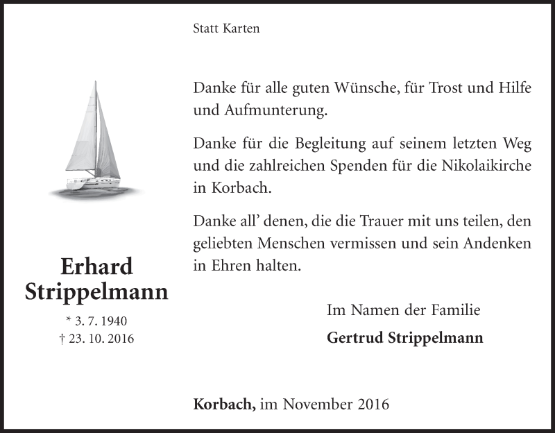 Hier finden Sie alle Traueranzeigen aus der Zeitung, die bisher für Erhard Strippelmann erschienen sind. Weitere Traueranzeigen, die in der Zeitung erscheinen, werden hier ebenfalls aufgelistet