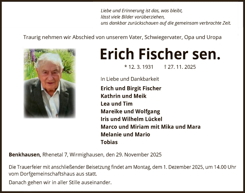 Hier finden Sie alle Traueranzeigen aus der Zeitung, die bisher für Erich Fischer sen. erschienen sind. Weitere Traueranzeigen, die in der Zeitung erscheinen, werden hier ebenfalls aufgelistet