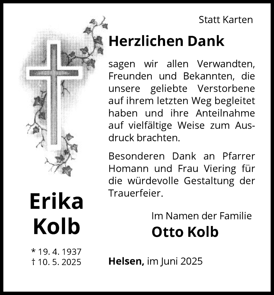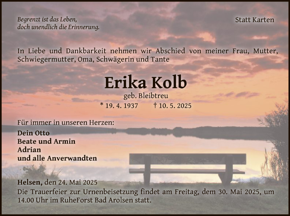Hier finden Sie alle Traueranzeigen aus der Zeitung, die bisher für Erika Kolb erschienen sind. Weitere Traueranzeigen, die in der Zeitung erscheinen, werden hier ebenfalls aufgelistet