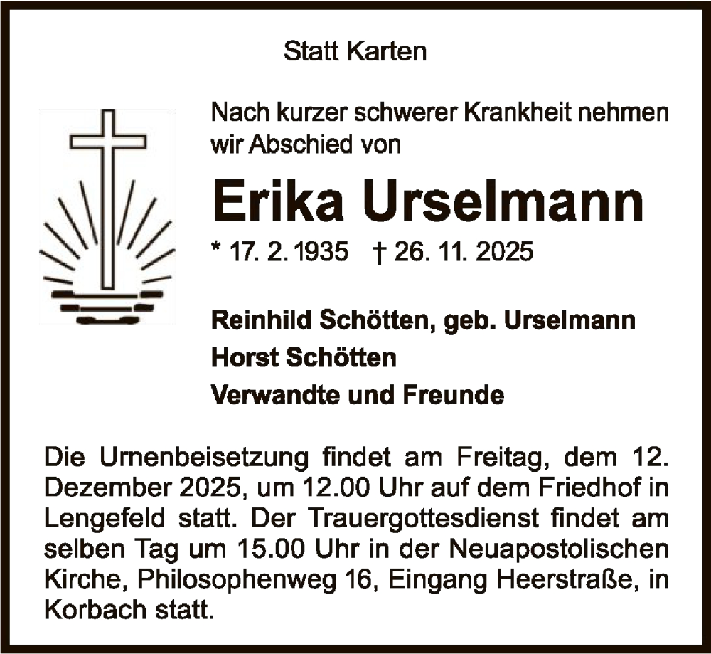 Hier finden Sie alle Traueranzeigen aus der Zeitung, die bisher für Erika Urselmann erschienen sind. Weitere Traueranzeigen, die in der Zeitung erscheinen, werden hier ebenfalls aufgelistet