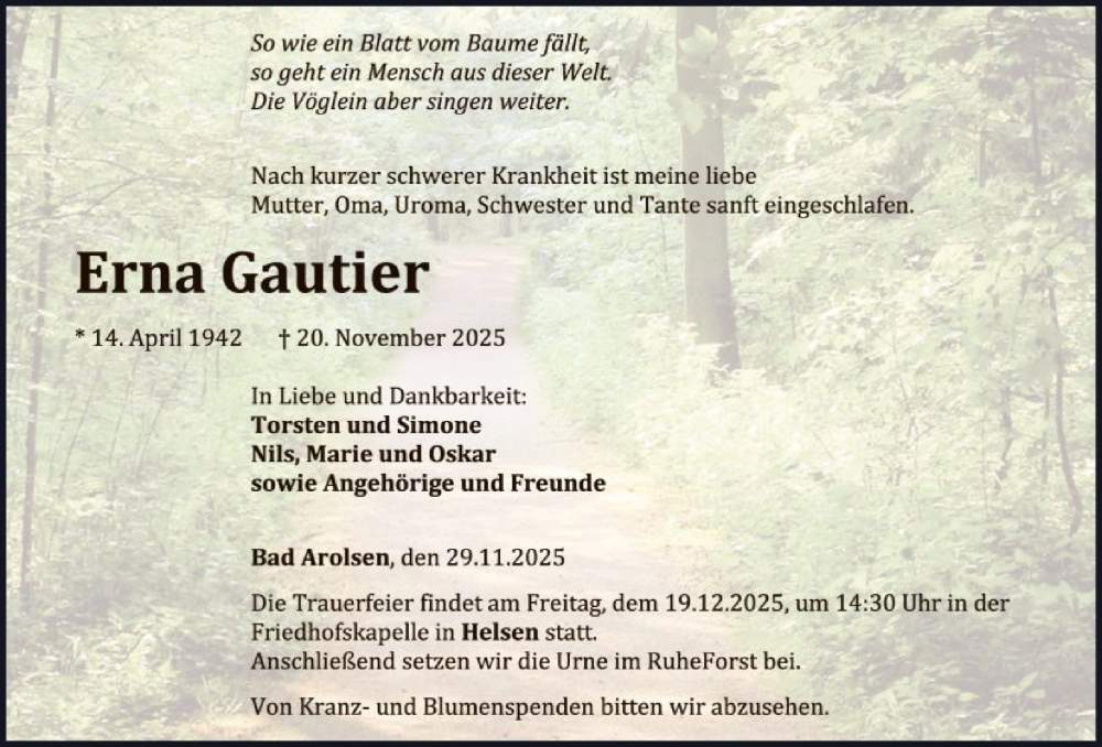 Hier finden Sie alle Traueranzeigen aus der Zeitung, die bisher für Erna Gautier erschienen sind. Weitere Traueranzeigen, die in der Zeitung erscheinen, werden hier ebenfalls aufgelistet