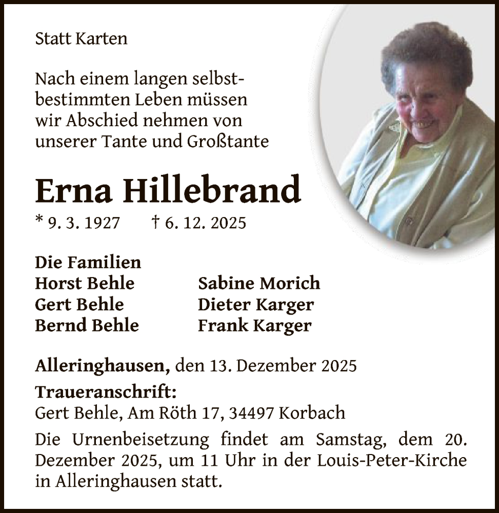 Hier finden Sie alle Traueranzeigen aus der Zeitung, die bisher für Erna Hillebrand erschienen sind. Weitere Traueranzeigen, die in der Zeitung erscheinen, werden hier ebenfalls aufgelistet