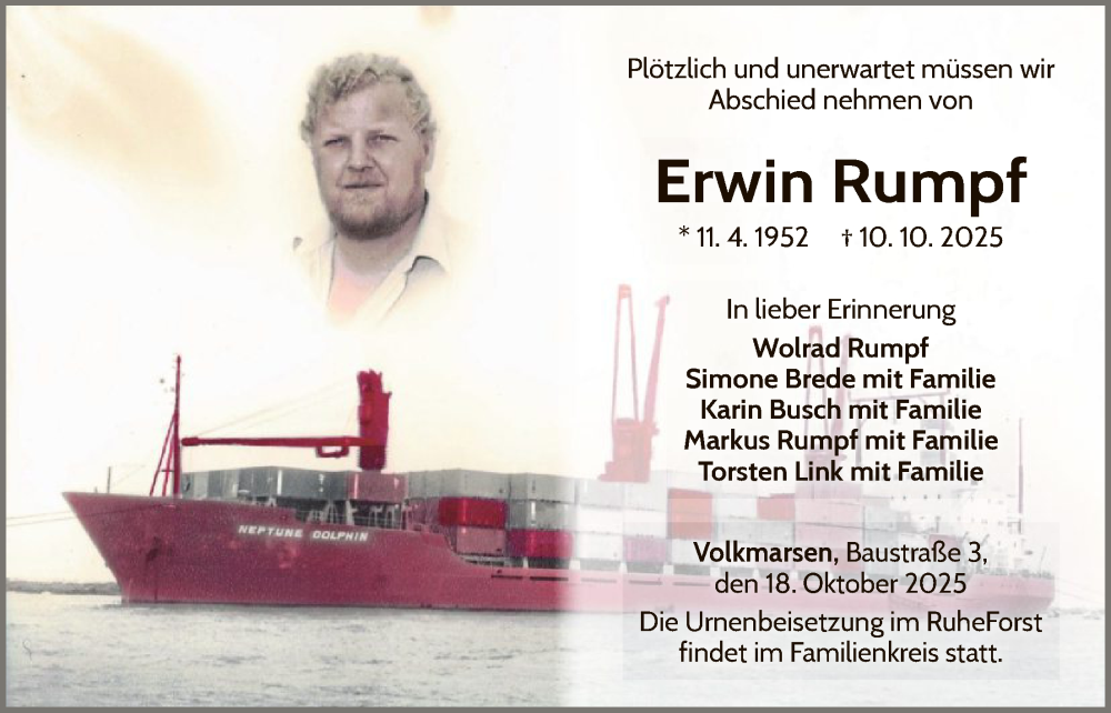 Hier finden Sie alle Traueranzeigen aus der Zeitung, die bisher für Erwin Rumpf erschienen sind. Weitere Traueranzeigen, die in der Zeitung erscheinen, werden hier ebenfalls aufgelistet