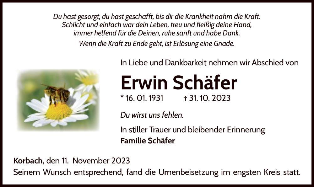 Hier finden Sie alle Traueranzeigen aus der Zeitung, die bisher für Erwin Schäfer erschienen sind. Weitere Traueranzeigen, die in der Zeitung erscheinen, werden hier ebenfalls aufgelistet