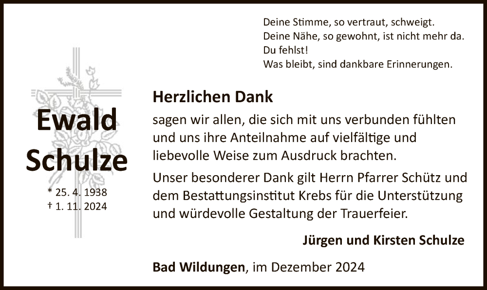 Hier finden Sie alle Traueranzeigen aus der Zeitung, die bisher für Ewald Schulze erschienen sind. Weitere Traueranzeigen, die in der Zeitung erscheinen, werden hier ebenfalls aufgelistet