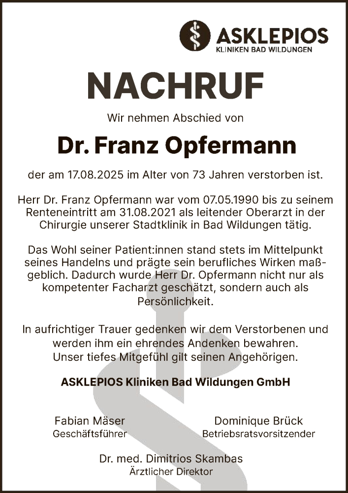 Hier finden Sie alle Traueranzeigen aus der Zeitung, die bisher für Franz Opfermann erschienen sind. Weitere Traueranzeigen, die in der Zeitung erscheinen, werden hier ebenfalls aufgelistet