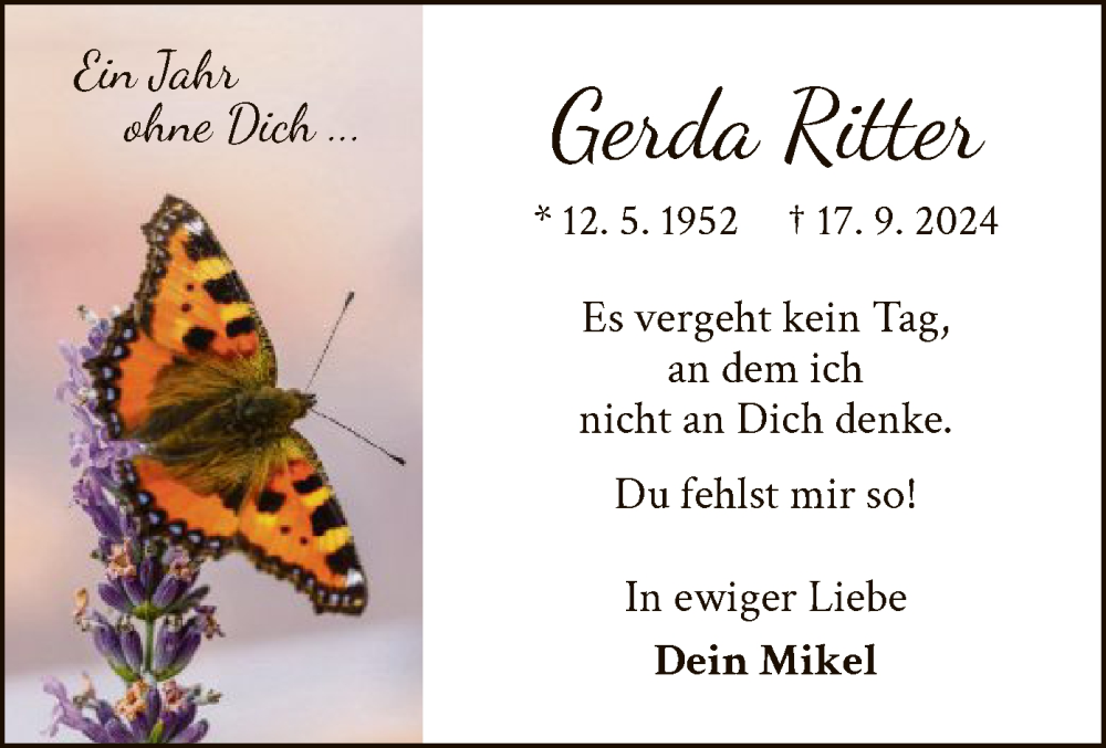 Hier finden Sie alle Traueranzeigen aus der Zeitung, die bisher für Gerda Ritter erschienen sind. Weitere Traueranzeigen, die in der Zeitung erscheinen, werden hier ebenfalls aufgelistet