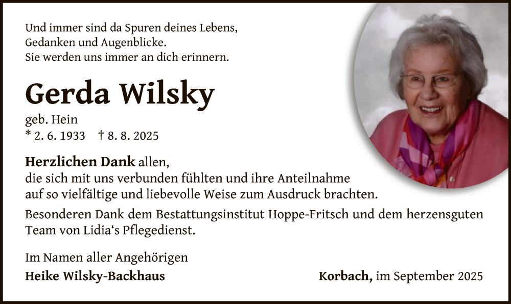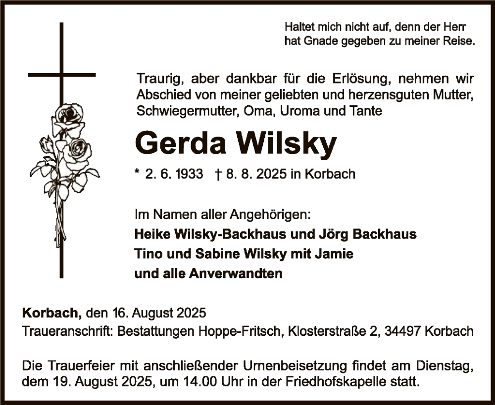 Hier finden Sie alle Traueranzeigen aus der Zeitung, die bisher für Gerda Wilsky erschienen sind. Weitere Traueranzeigen, die in der Zeitung erscheinen, werden hier ebenfalls aufgelistet
