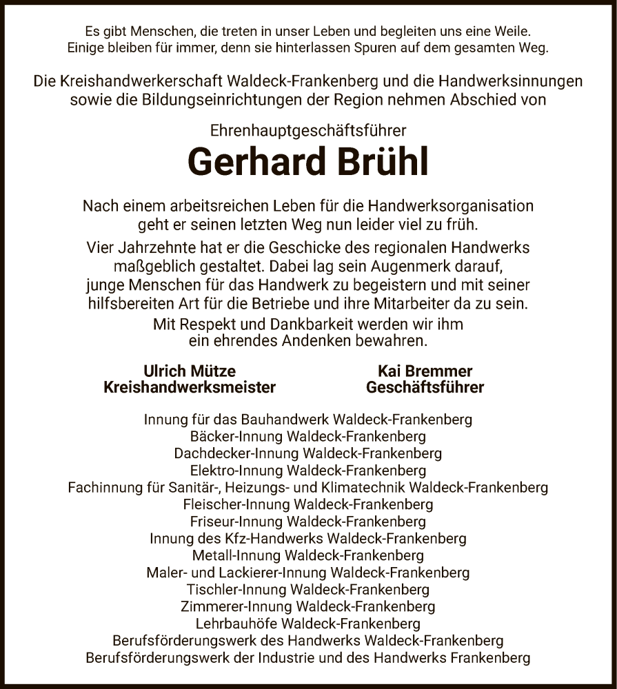 Hier finden Sie alle Traueranzeigen aus der Zeitung, die bisher für Gerhard Brühl erschienen sind. Weitere Traueranzeigen, die in der Zeitung erscheinen, werden hier ebenfalls aufgelistet