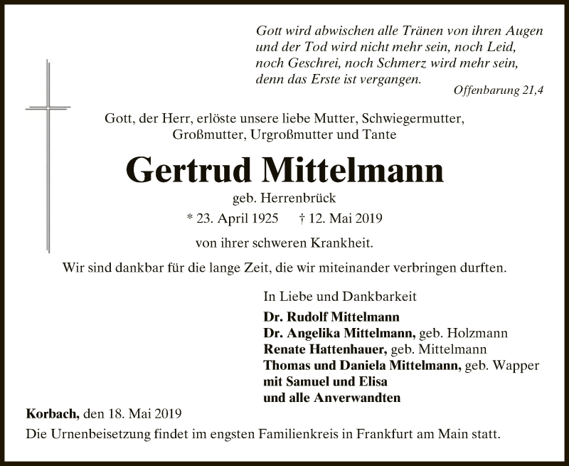 Hier finden Sie alle Traueranzeigen aus der Zeitung, die bisher für Gertrud Mittelmann erschienen sind. Weitere Traueranzeigen, die in der Zeitung erscheinen, werden hier ebenfalls aufgelistet
