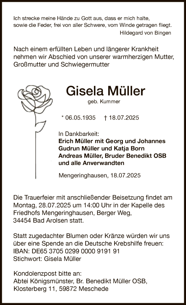 Hier finden Sie alle Traueranzeigen aus der Zeitung, die bisher für Gisela Müller erschienen sind. Weitere Traueranzeigen, die in der Zeitung erscheinen, werden hier ebenfalls aufgelistet