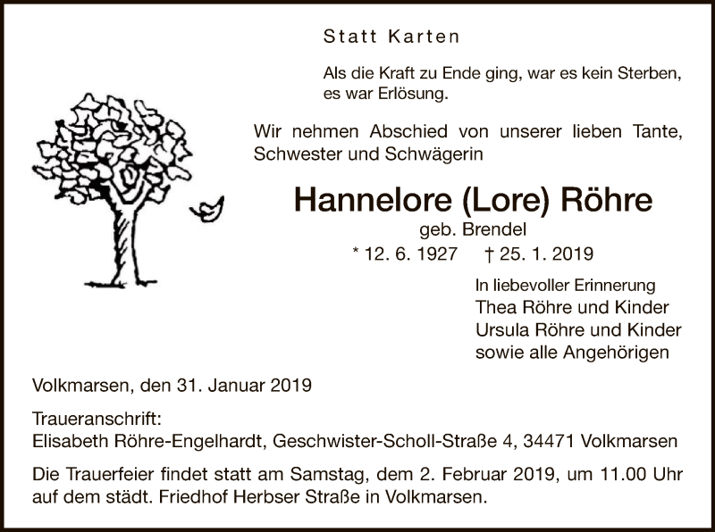 Hier finden Sie alle Traueranzeigen aus der Zeitung, die bisher für Hannelore Röhre erschienen sind. Weitere Traueranzeigen, die in der Zeitung erscheinen, werden hier ebenfalls aufgelistet