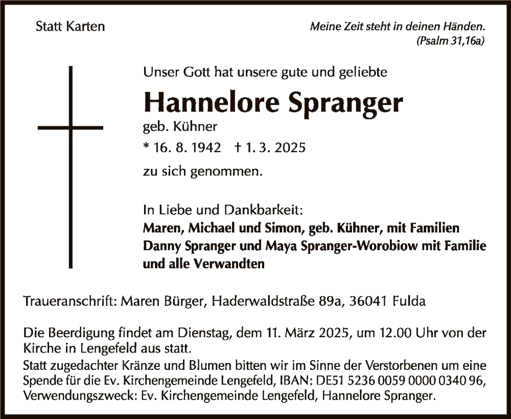 Hier finden Sie alle Traueranzeigen aus der Zeitung, die bisher für Hannelore Spranger erschienen sind. Weitere Traueranzeigen, die in der Zeitung erscheinen, werden hier ebenfalls aufgelistet