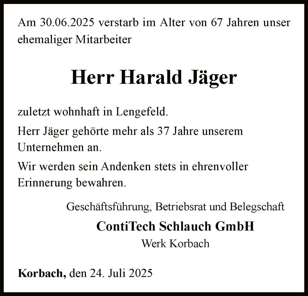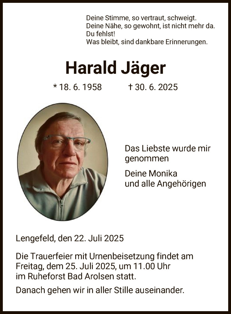 Hier finden Sie alle Traueranzeigen aus der Zeitung, die bisher für Harald Jäger erschienen sind. Weitere Traueranzeigen, die in der Zeitung erscheinen, werden hier ebenfalls aufgelistet