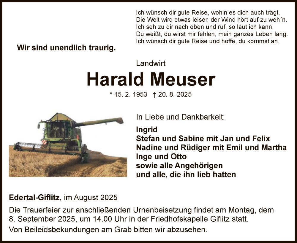 Hier finden Sie alle Traueranzeigen aus der Zeitung, die bisher für Harald Meuser erschienen sind. Weitere Traueranzeigen, die in der Zeitung erscheinen, werden hier ebenfalls aufgelistet