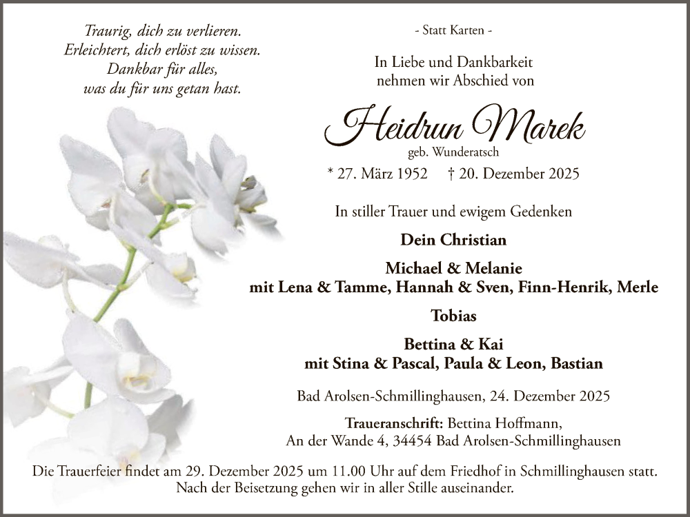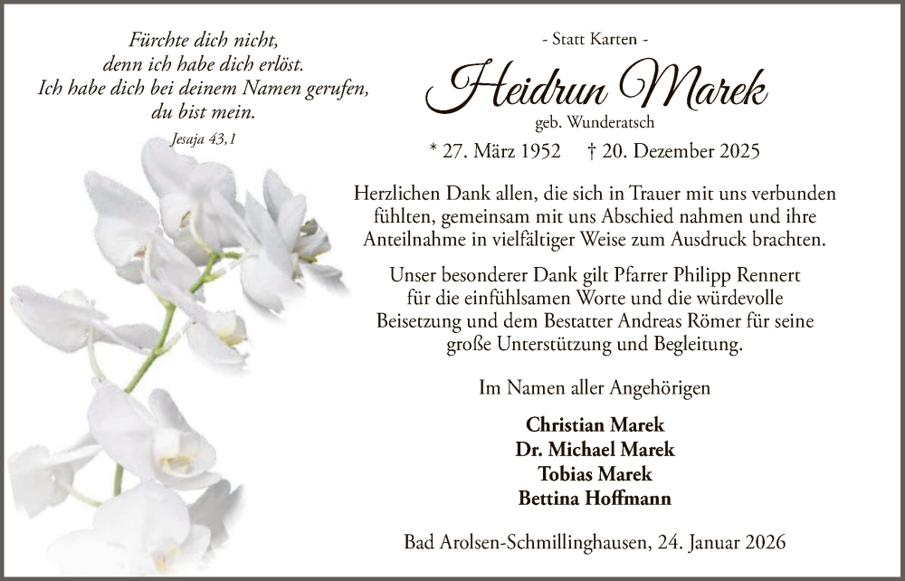 Hier finden Sie alle Traueranzeigen aus der Zeitung, die bisher für Heidrun Marek erschienen sind. Weitere Traueranzeigen, die in der Zeitung erscheinen, werden hier ebenfalls aufgelistet