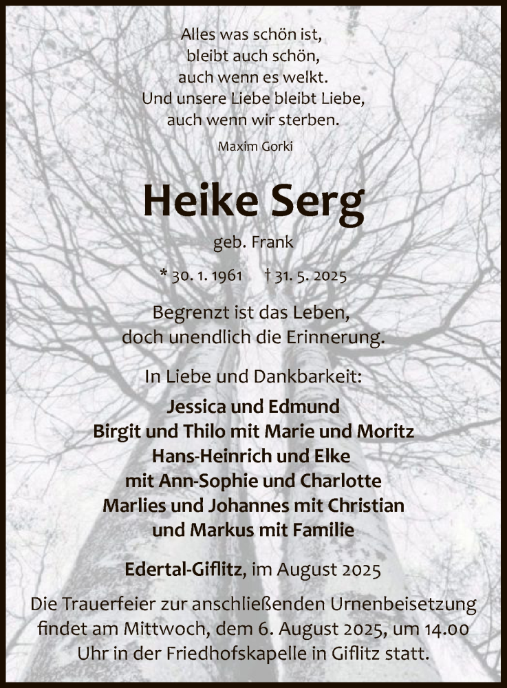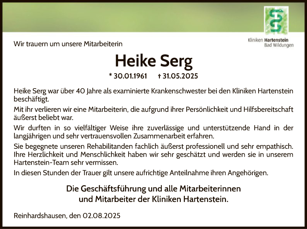 Hier finden Sie alle Traueranzeigen aus der Zeitung, die bisher für Heike Serg erschienen sind. Weitere Traueranzeigen, die in der Zeitung erscheinen, werden hier ebenfalls aufgelistet