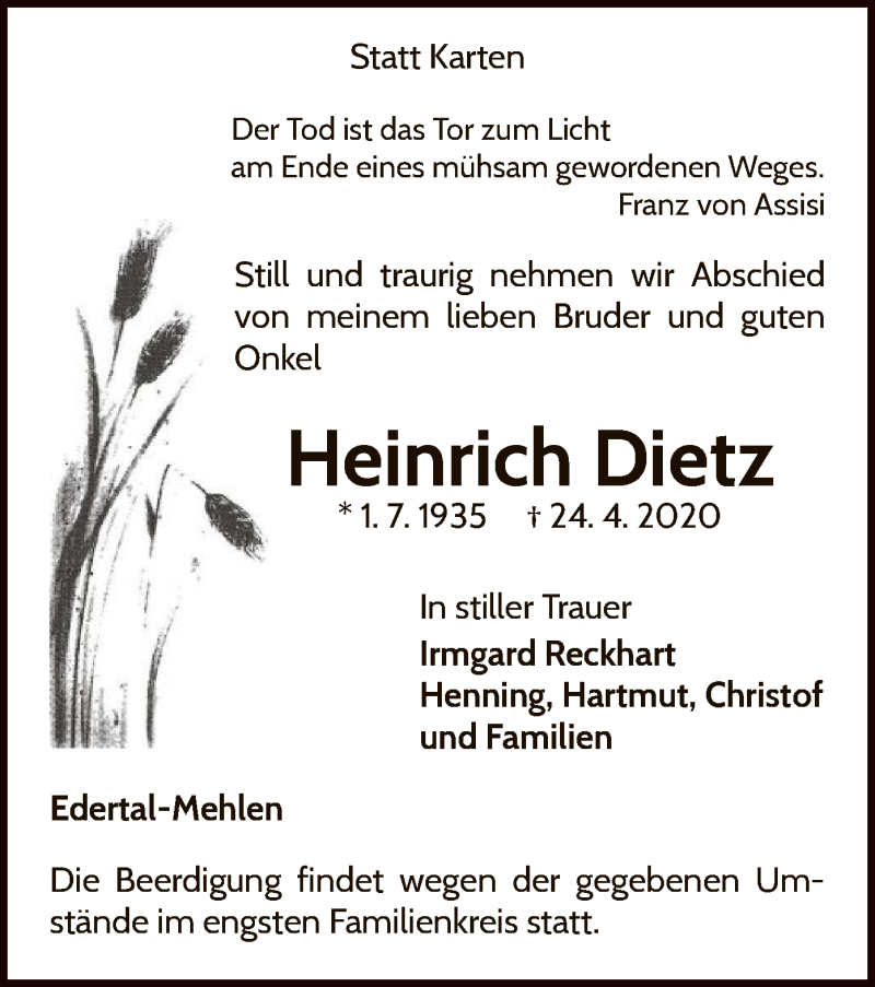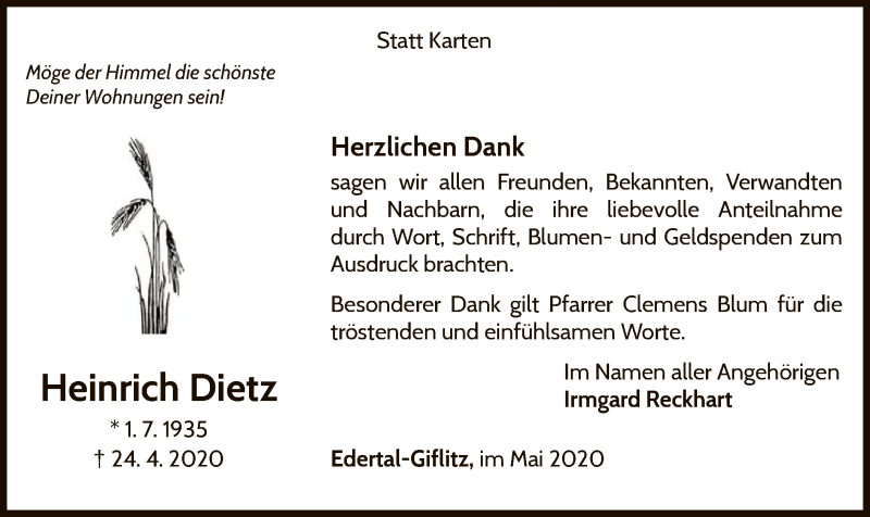 Hier finden Sie alle Traueranzeigen aus der Zeitung, die bisher für Heinrich Dietz erschienen sind. Weitere Traueranzeigen, die in der Zeitung erscheinen, werden hier ebenfalls aufgelistet