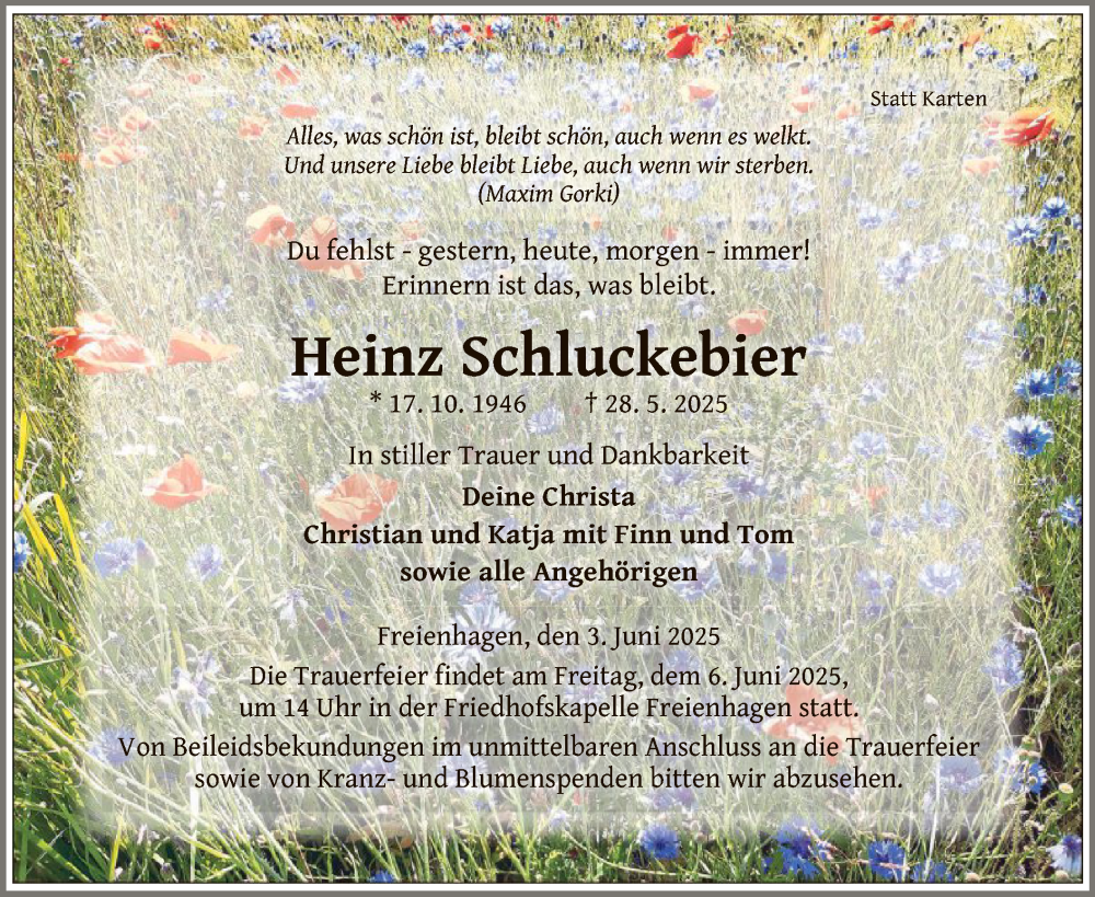 Hier finden Sie alle Traueranzeigen aus der Zeitung, die bisher für Heinz Schluckebier erschienen sind. Weitere Traueranzeigen, die in der Zeitung erscheinen, werden hier ebenfalls aufgelistet