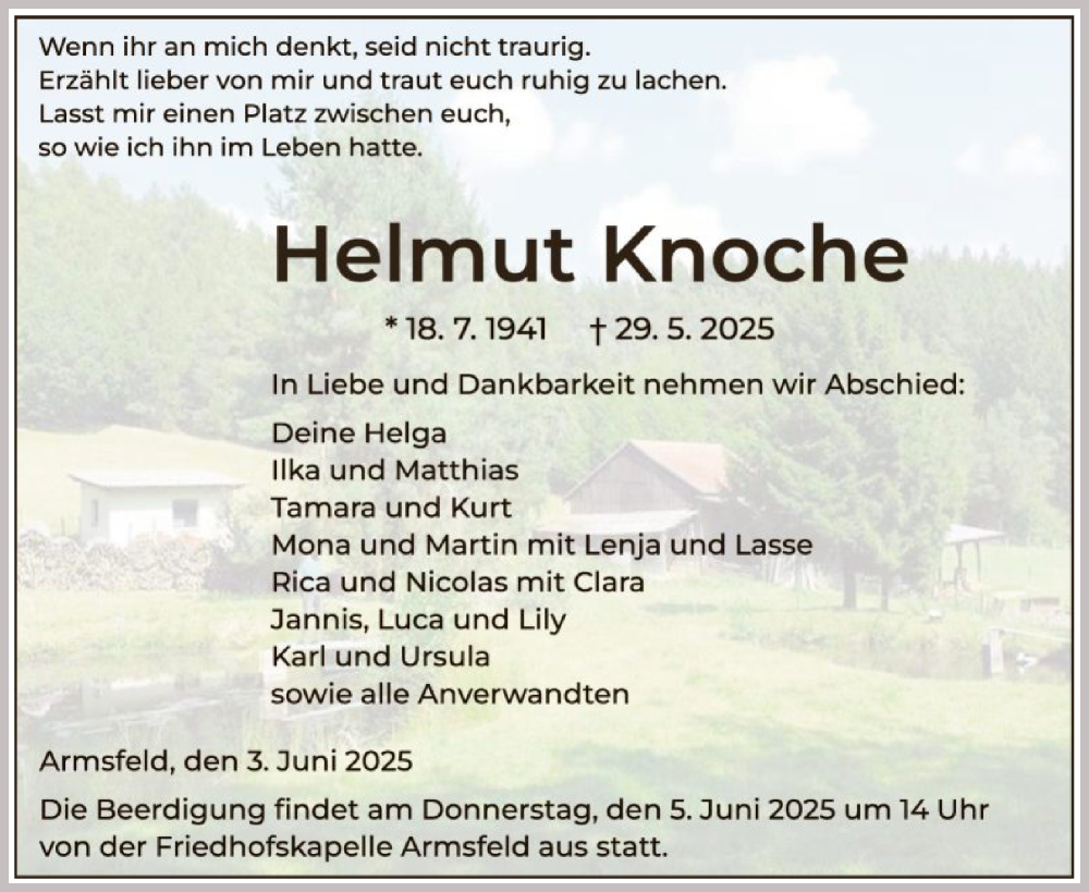 Hier finden Sie alle Traueranzeigen aus der Zeitung, die bisher für Helmut Knoche erschienen sind. Weitere Traueranzeigen, die in der Zeitung erscheinen, werden hier ebenfalls aufgelistet