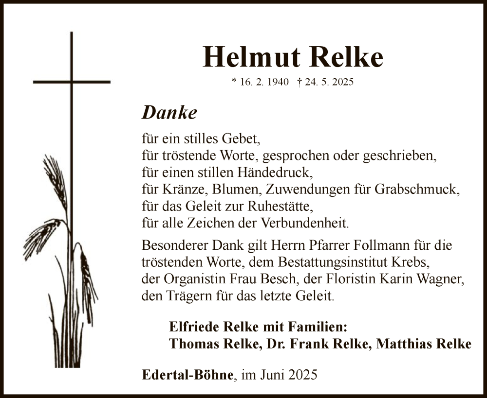Hier finden Sie alle Traueranzeigen aus der Zeitung, die bisher für Helmut Relke erschienen sind. Weitere Traueranzeigen, die in der Zeitung erscheinen, werden hier ebenfalls aufgelistet