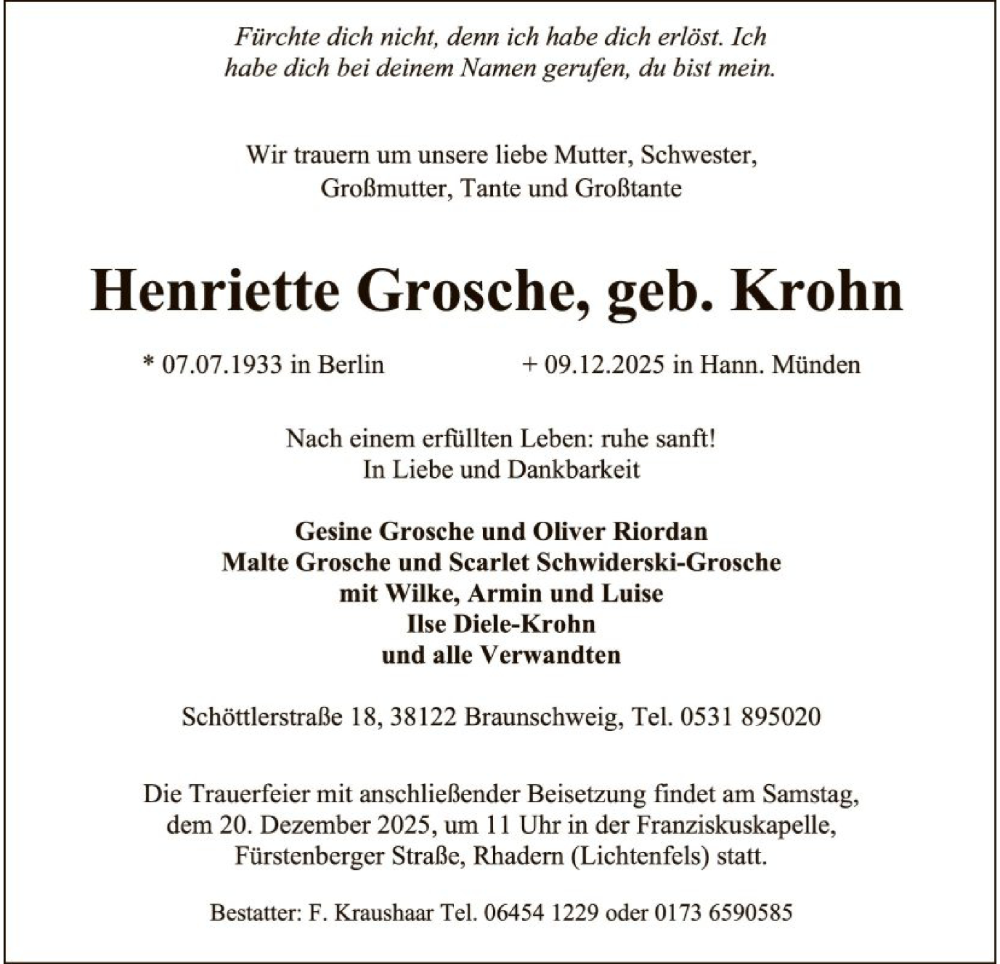 Hier finden Sie alle Traueranzeigen aus der Zeitung, die bisher für Henriette Grosche erschienen sind. Weitere Traueranzeigen, die in der Zeitung erscheinen, werden hier ebenfalls aufgelistet