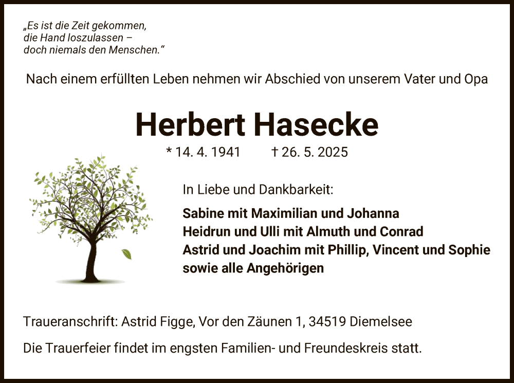 Hier finden Sie alle Traueranzeigen aus der Zeitung, die bisher für Herbert Hasecke erschienen sind. Weitere Traueranzeigen, die in der Zeitung erscheinen, werden hier ebenfalls aufgelistet