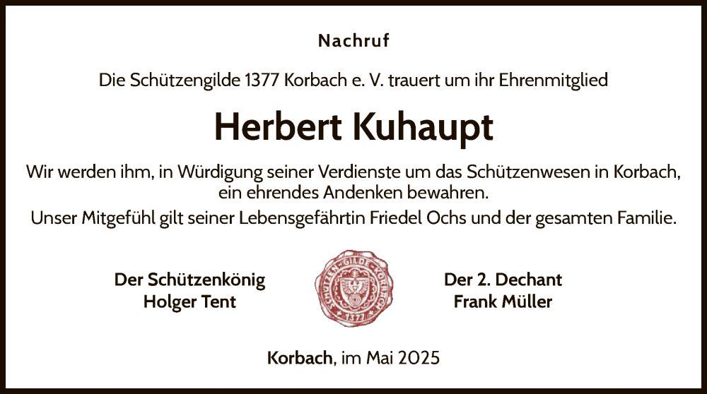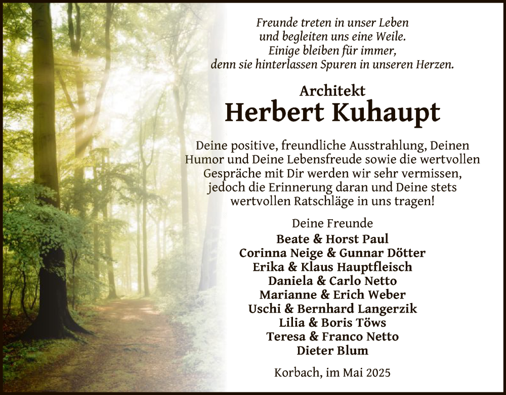Hier finden Sie alle Traueranzeigen aus der Zeitung, die bisher für Herbert Kuhaupt erschienen sind. Weitere Traueranzeigen, die in der Zeitung erscheinen, werden hier ebenfalls aufgelistet