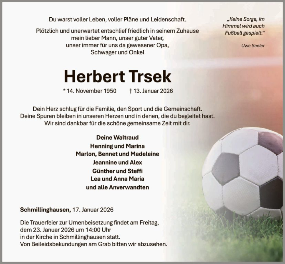 Hier finden Sie alle Traueranzeigen aus der Zeitung, die bisher für Herbert Trsek erschienen sind. Weitere Traueranzeigen, die in der Zeitung erscheinen, werden hier ebenfalls aufgelistet