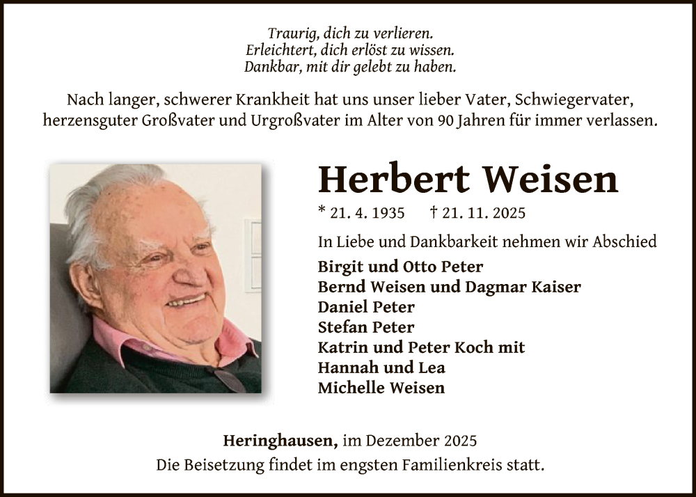 Hier finden Sie alle Traueranzeigen aus der Zeitung, die bisher für Herbert Weisen erschienen sind. Weitere Traueranzeigen, die in der Zeitung erscheinen, werden hier ebenfalls aufgelistet