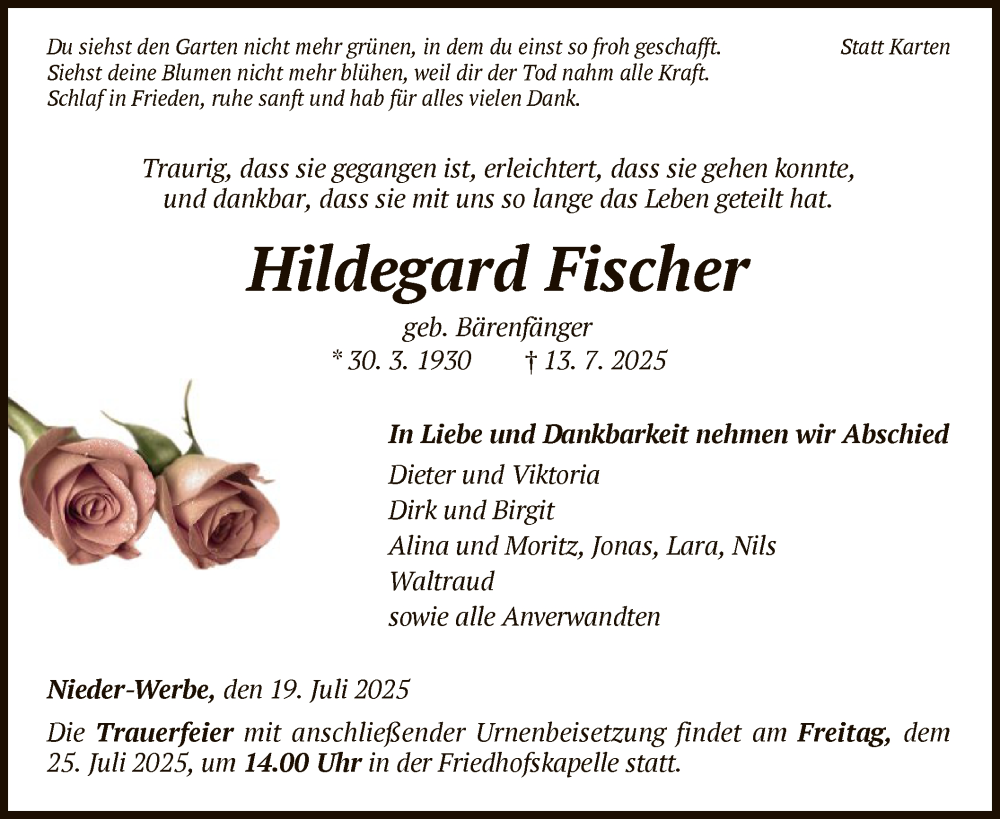 Hier finden Sie alle Traueranzeigen aus der Zeitung, die bisher für Hildegard Fischer erschienen sind. Weitere Traueranzeigen, die in der Zeitung erscheinen, werden hier ebenfalls aufgelistet